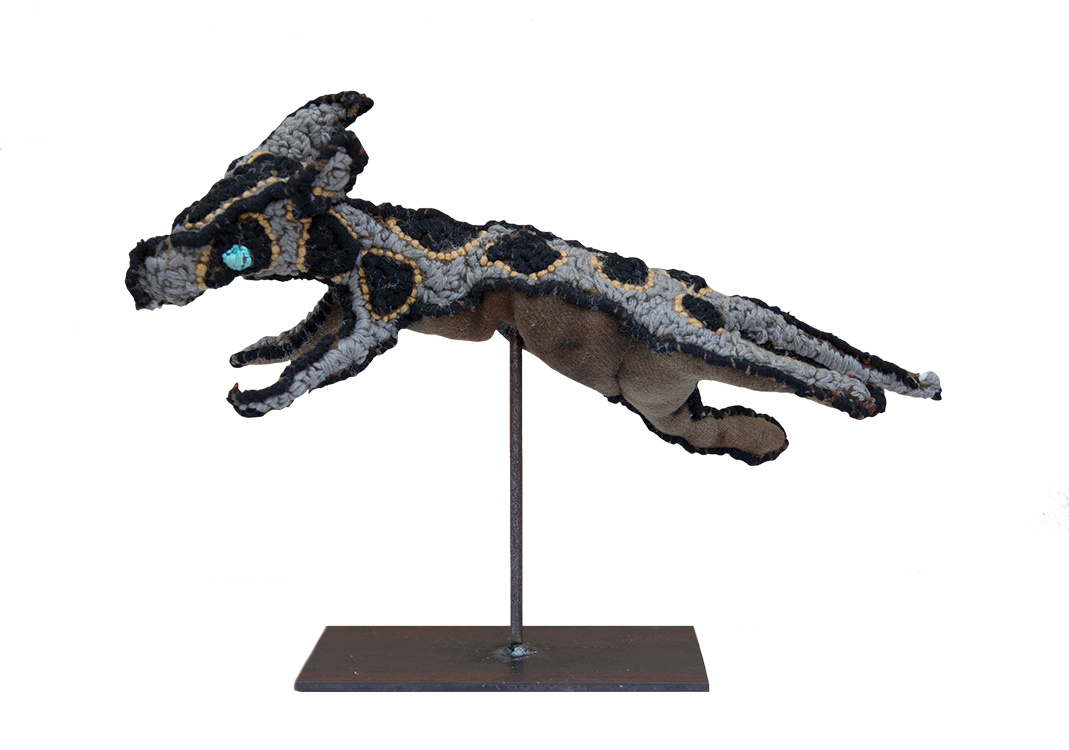 This is a soft sculpture made with recycled woollen blankets. The blankets are dyed using local Arrernte plants and rusty bits of metal. The blankets are then used as the base material for the sculpture.