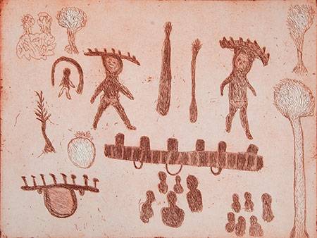 This etching represents the Kurtal ceremonial dance, an important tjukurrpa (dreaming) story for the Walmajarri (language group of Fitzroy Valley) and a sacred site in the Great Sandy Desert. The headdresses, which represent the clouds that the rainmakers create, are still used today in traditional dance by the men who hold the story for this sacred place.