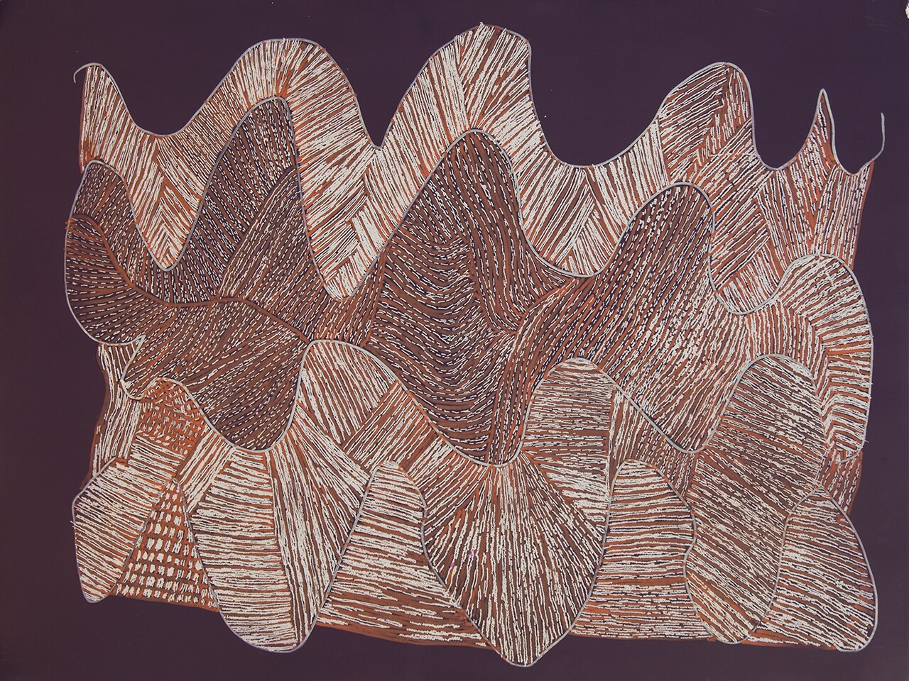 This painting has song and story, singing and dancing, which is known as Inarra. The painting represents the digging, singing, and dancing that occur when the waterhole is dug. It is a ceremony for digging the jila and bringing the rain.