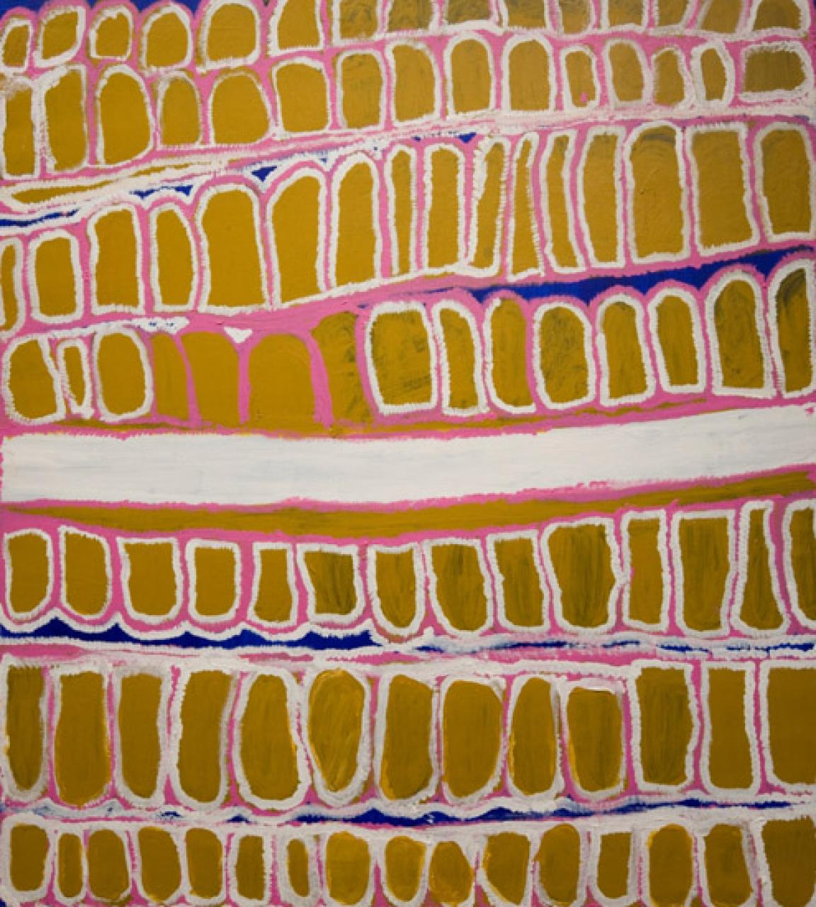 This work depicts Lake MacDonald, a large salt lake on the Western Australian border and the home country of Narputta. Surrounding the lake is the puli (rocky hills) and tali (sand hills) stretching away in all directions. It is a harsh but beautiful landscape that holds many important tjukurrpa stories which Narputta maintains through her work.