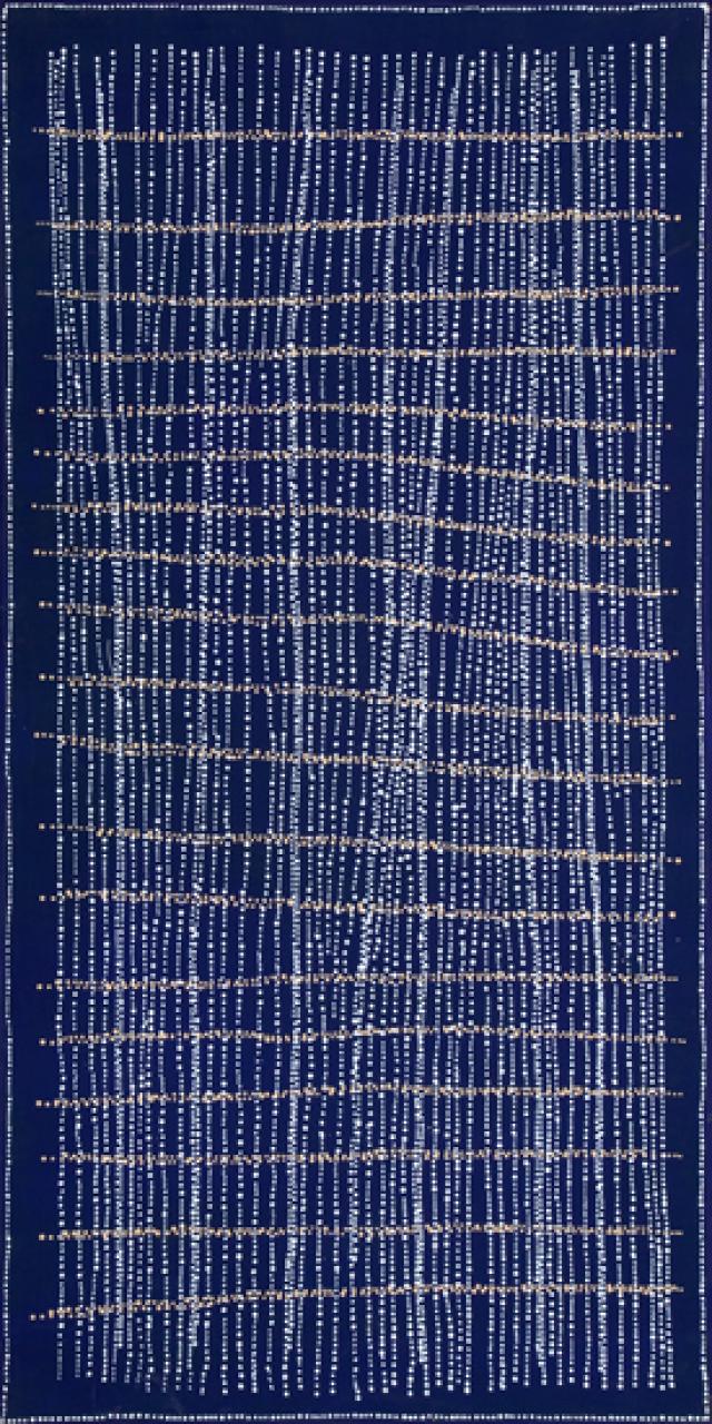 Their journey took them far to the east beyond the boundaries of Warlpiri country. The ‘ngalyipi’ vine grows up the trunks and limbs of the ‘kurrkara’ (desert oak, Allocasuarina decaisneana) trees. ‘Ngalyipi’ is a sacred vine to Napangardi and Napanangka women that has many uses. It can be used as a ceremonial wrap, as a strap to carry ‘parrajas’ (wooden bowls) that are laden with bush tucker and as a tourniquet for headaches.