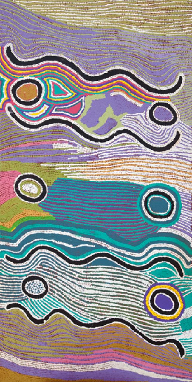 The country of this Dreaming is Janyinki, west of Yuendumu and significant to Napangardi and Napanangka women who are the custodians of the Dreaming that created the area. The Dreaming describes the journey of a group of women of all ages who travelled east gathering food and collecting "Ngalyipi" (Tinospora smilacina or snake vine). This vine served several purposes. It could be used as a strap to carry parraja (food containers), as a tourniquet or as ceremonial rope when making witi poles.